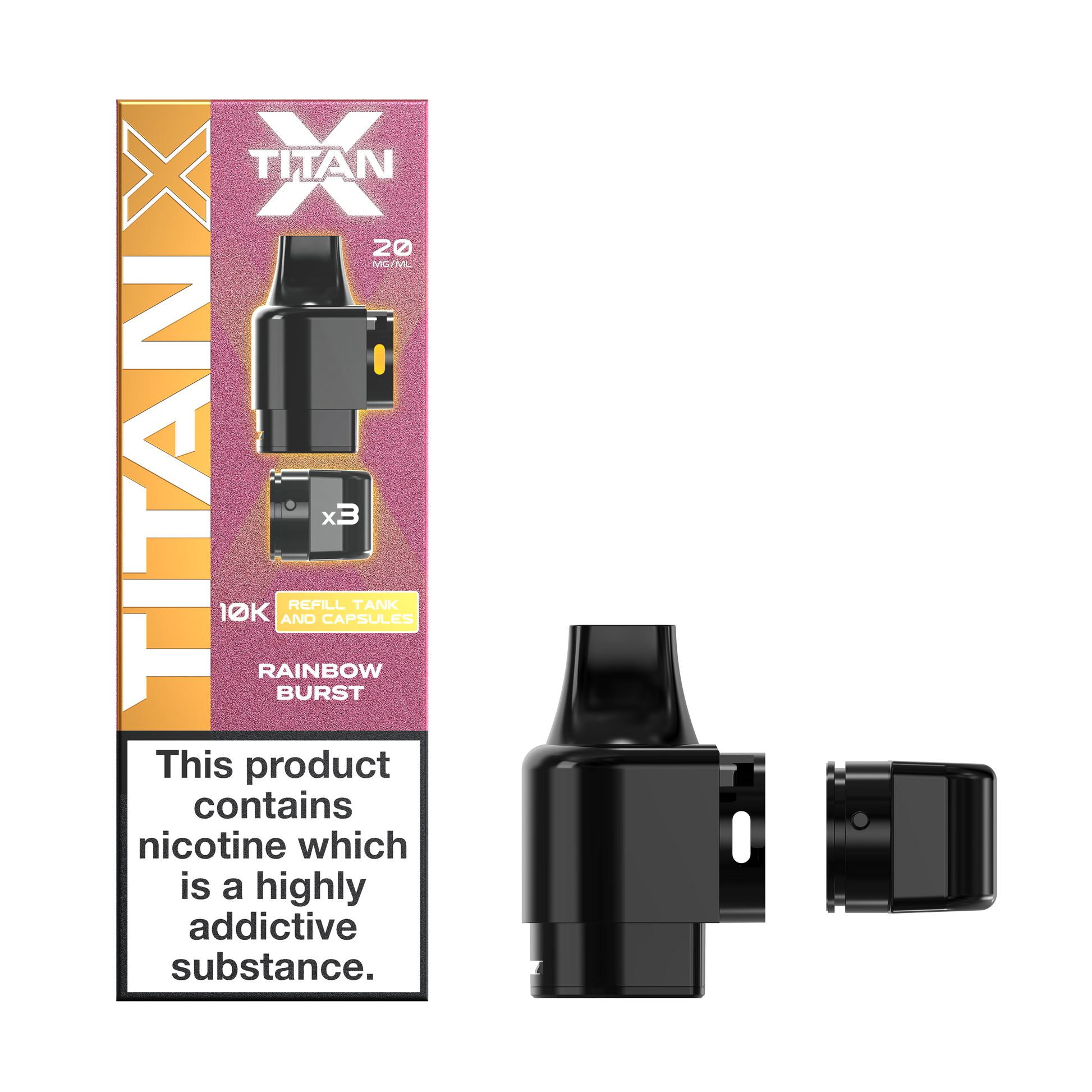 Experience a colourful medley of fruity flavours with Rainbow Burst in the Titan X Pod. This vibrant mix combines notes of juicy fruits like strawberry, orange, pineapple, and melon for a sweet and refreshing vape that keeps every puff exciting.